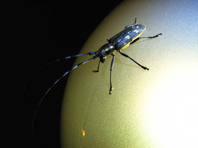 ホテル前の装飾電灯についていた。伊豆諸島特産の亜種。内地の桑畑に多いキボシカミキリに似ているが、こちらのカミキリムシの方がずっと大きい。